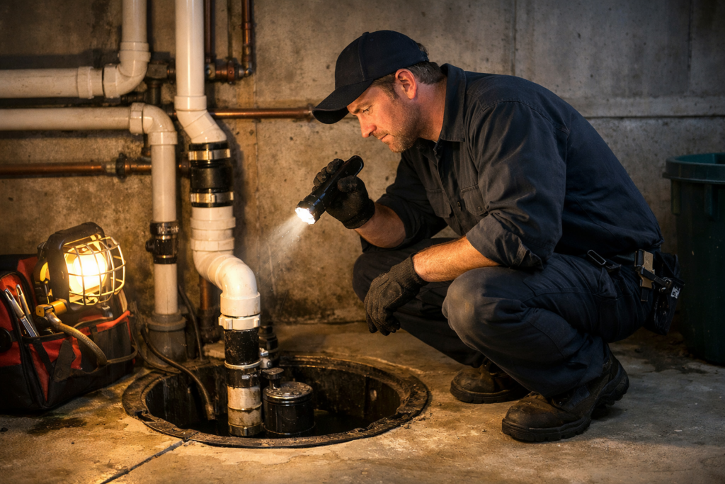 Sump pumps that ran hard all winter may have worn float switches, corroded wiring, or a discharge line that froze and cracked. A pump that runs — but doesn’t discharge correctly — gives you a false sense of security.