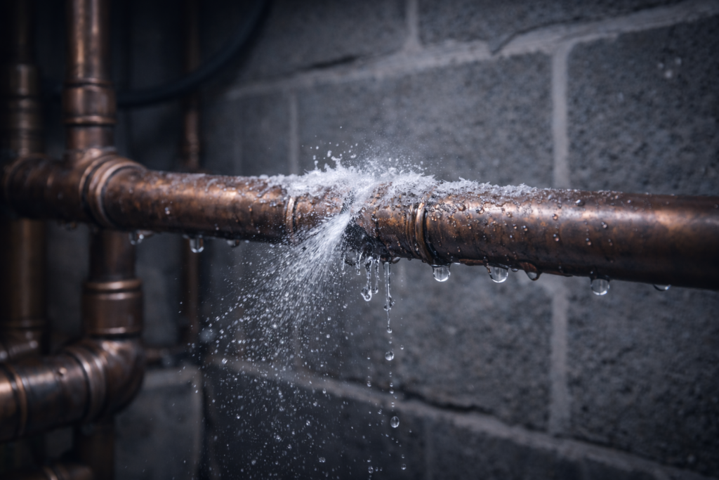 Unexplained wet spots on walls or ceilings, a sudden increase in your water bill, reduced water pressure at multiple fixtures, or a faint musty odor near an exterior wall are all red flags that a pipe may have cracked over winter.